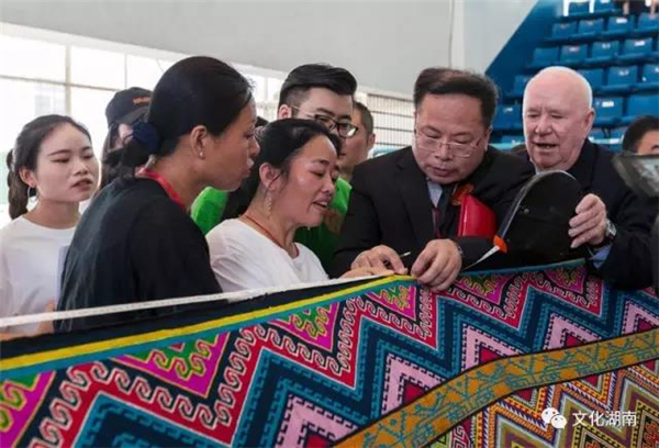 仪式现场,世界纪录协会高级认证官菲利普·费文涛分别为8件作品的创作者或设计者颁发了世界纪录认证证书,湘西州有关领导分别为各县市颁发了赠献证书。(来源:湖南省文化厅)