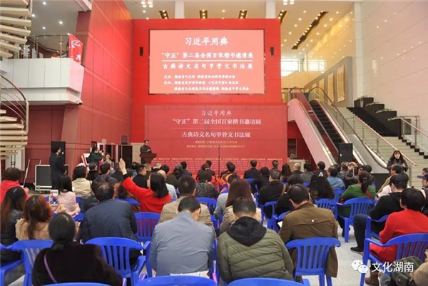 3月16日,由湖南省文化馆主办,《文艺生活·艺术中国》杂志、湖南省东方诗书画院、湖南省文化馆美术书法摄影部等承办的“习近平用典——‘守正’第二届全国百家楷书邀请展”在省文化馆艺术长廊开幕。湖南省社科联党组书记、副主席宋智富,湖南省文化厅副巡视员王鹏等出席并致辞。