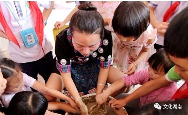 洪江市芙蓉小学的学生们现场体验制陶过程