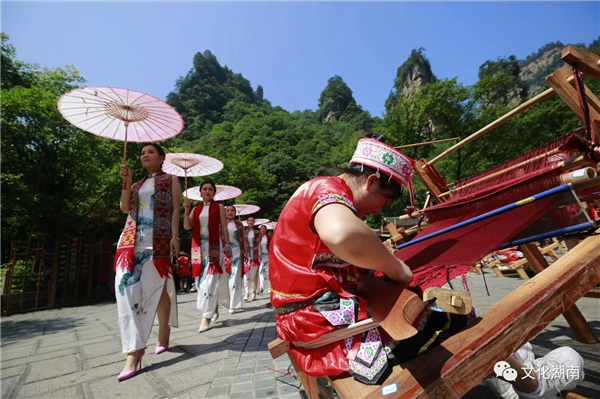 6月7日,张家界市在武陵源核心景区举办土家族织锦进景区非遗展演展示活动,近百名土家族织锦织女在峰林的见证下现场向中外游客展示张家界省级非物质文化遗产土家族织锦技艺。当地旗袍爱好者还现场走秀,展示了土家族织锦提包、围巾等产品。