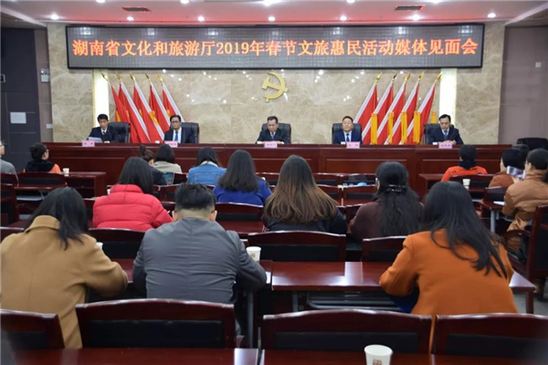 文化大集、春节联欢会、展览、庙会……春节临近,各类丰富多彩的文旅惠民活动成为了全省人民春节里一道必不可少的文化旅游大餐。1月23日,湖南省文化和旅游厅召开2019年春节文旅惠民活动媒体见面会,通报春节期间全省文化旅游惠民活动情况。湖南省文化和旅游厅党组成员、副厅长肖凌之发布新闻,厅副巡视员王鹏等出席并回答记者提问。