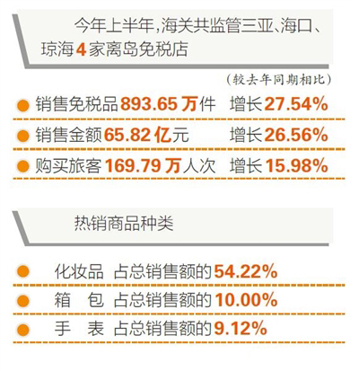 2019年1月,海口、琼海两家市内免税店通过海关验收正式开业运营,岛内免税店布局更加均衡,离岛旅客购物更加便利,今年上半年,海关分别监管三亚海棠湾、海口美兰机场、日月广场及博鳌东屿岛免税店销售免税品49.98亿元、11.77亿元、3.66亿元和0.42亿元。