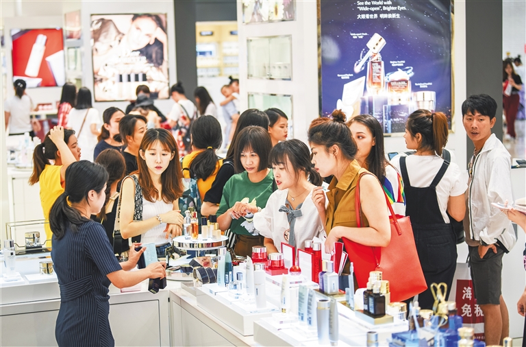 海口市国兴大道日月广场免税店内,各类商品琳琅满目,吸引众多消费者前来选购