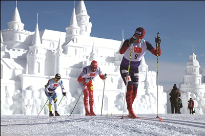 长春净月潭瓦萨国际滑雪节,运动员滑过景区主要景点 高福兴 摄