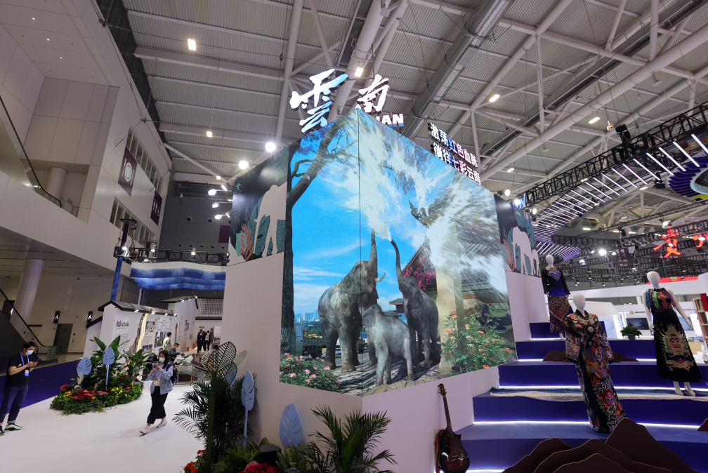 云南展区所在的深圳国际会展中心11号展馆是本届文博会新增设的“文旅融合与文化消费馆”,一颗印的空间布局,鲜花点缀的迎宾大道,充满设计感的扎染布艺,雪山、雨林、滇金丝猴、亚洲象等云南元素将人带入诗意栖居的旅游天堂。