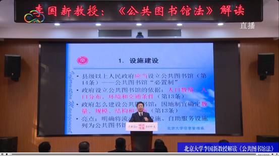 李国新教授分别从立法背景、立法过程、法律条文的主要内容、本法对公共图书馆事业发展的重要意义及深远影响等方面逐一进行了深入浅出的讲解。李国新指出,《公共图书馆法》奠定了中国特色的公共图书馆法律基础,强化了政府设立和保障公共图书馆的责任,推动了公共图书馆体制机制的改革,促进了《公共图书馆法》服务和现代科技融合发展,鼓励了社会力量参与公共图书馆事业建设,建立了公共图书馆提供服务的法律规范,对我国公共图书馆事业发展具有里程碑式的意义。