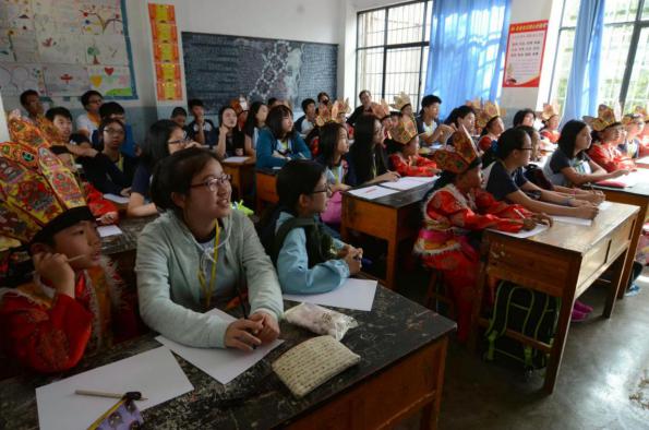 同学们在黄山完小学习体验纳西族传统祭祀东巴舞