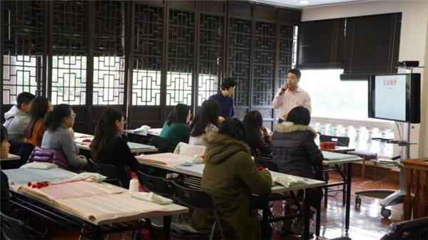 首届中国刺绣艺术大师黄伟雄在讲解珠绣