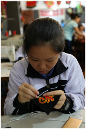 同学们认真缝制彝族荷包,准备带回家送给亲人