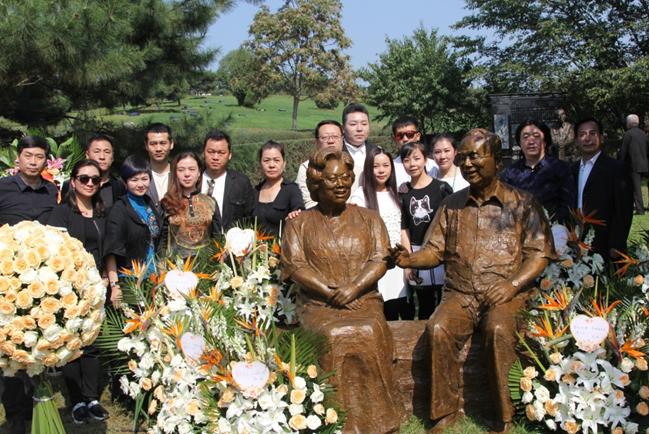 家属和铜像合影