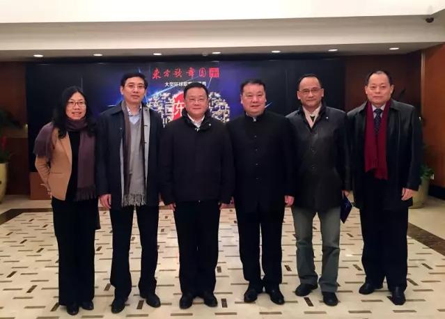 中国东方演艺集团董事长宋官林和上海市委宣传部副部长胡劲军(左三)、新民晚报总编辑陈启伟、副总编阎小娴(左一、二),上海京剧院院长单跃进(右二)、上海大剧院艺术中心总裁张哲(右一)