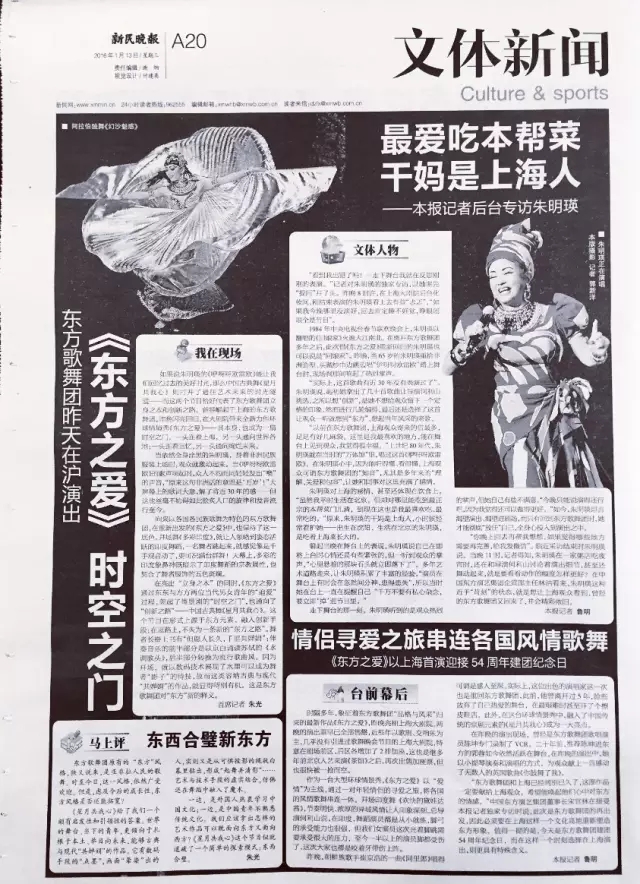 1月13日,新民晚报以整版篇幅报道《东方之爱》上海演出盛况,并称赞这台节目“如果说朱明瑛的《咿呀呀欧雷欧》能让我们回忆过去的美好时光;那么中国古典舞《星月共我心》则打开了通往艺术未来的时光隧道——而这两个节目恰好代表了东方歌舞团立身之本和创新之路。曾经崛起于上海的东方歌舞团在上海大剧院带来全新力作环球情景秀《东方之爱》——其本身,也成为一座时空之门,一头连着上海,另一头通向世界各地;一头连着回忆,另一头通向绚烂未来”。