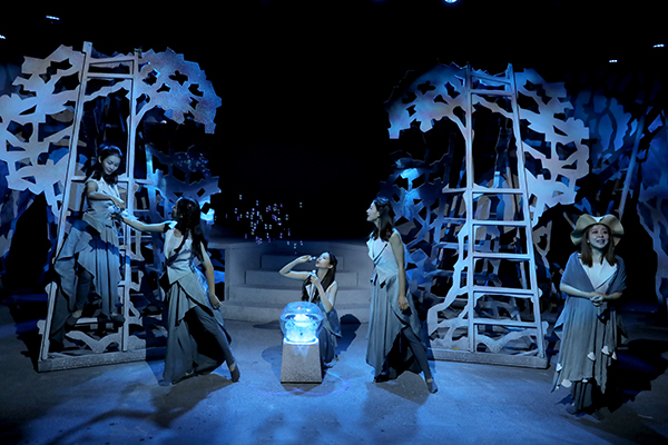 演出一开始,五位扮演美人鱼的演员分别提着一个水桶依次走上舞台,他们头戴泳帽,脚上穿着潜水用的脚蹼,通过不同节奏的走路声音,瞬间吸引了观众的注意力。接下来,这个水桶仿佛成为了连接海底世界的一个秘密通道,演员从水桶中拿出了一条鱼、一座城堡、一颗琥珀、一扇贝壳、一颗珍珠……渐渐地,舞台中央的玻璃缸中呈现出了人鱼们的家,而随着一桶接一桶水的注入,观众们也随着演员来到了海底世界。