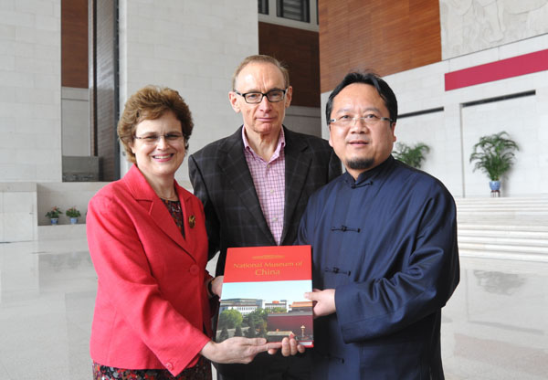 国家博物馆副馆长都海江(右一)向澳大利亚外长鲍勃·卡尔(中)及澳大利亚驻华大使孙芳安(左一)赠送国家博物馆图录