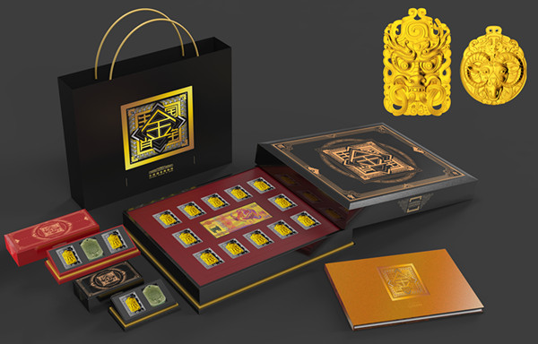 《国宝生肖金》是以“国博国宝”为原型设计研发的一系列贵金属套装。秉持“国之重器,薪火相传;敦宗睦族,既寿永昌”的设计理念,《国宝生肖金》以国博国宝级文物形象为原型,取材四羊方尊、西汉龙纹玉璧、战国双龙形佩、南朝画像砖、隋白瓷、黑釉唐三彩、五代十国观音像、宋代石刻、龙泉窑葫芦瓶等“国博国宝”造型精华,同时还运用了各种传统经典纹样如缠枝纹、折枝灵芝纹、蝠莲纹、凤翼纹等,将东方美学传统和现代美学生活二者结合,使得传统器物形象随时代审美观念的转变,展现出特有的时代感。
