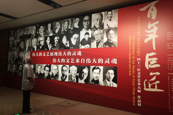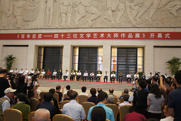 为深入学习、贯彻习近平总书记关于文化建设的一系列重要讲话精神和中共中央办公厅、国务院办公厅印发的《关于实施中华优秀传统文化传承发展工程的意见》要求,迎接党的十九大胜利召开,由中国文学艺术界联合会、国家新闻出版广电总局、中国艺术研究院、中央电视台、中国国家博物馆、中共北京市委宣传部共同主办,中国文学艺术基金会、中央新影集团、百年艺尊(北京)文化传播有限公司、北京银谷艺术馆承办的“百年巨匠——四十三位文学艺术大师作品展”,2017年9月16日上午10时在中国国家博物馆举行了隆重的开幕式。中宣部、文化部、国家新闻出版广电总局、中国文学艺术界联合会、中国艺术研究院、中央电视台等部门负责人,艺术界、新闻界知名人士参加开幕式。