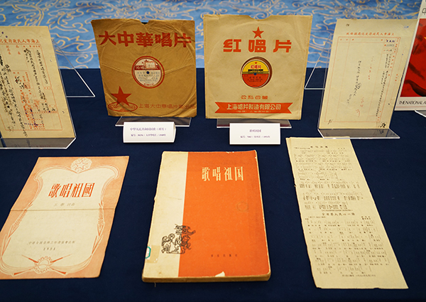 图为《中华人民共和国国歌》和《歌唱祖国》唱片及相关文件资料。