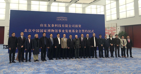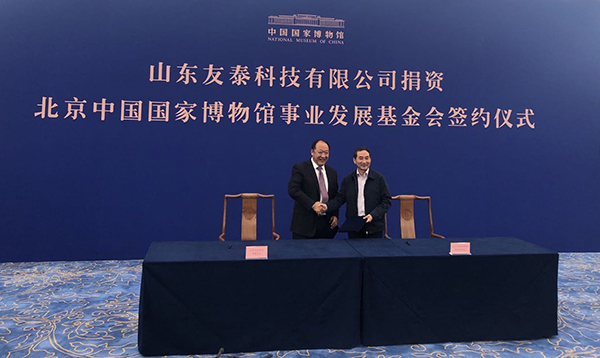 2019年10月15日,山东友泰科技有限公司和北京中国国家博物馆事业发展基金会在国家博物馆举行签约仪式。北京中国国家博物馆事业发展基金会代表黄振春和山东友泰科技有限公司董事长李存友代表双方签署捐赠协议。山东友泰科技有限公司此次捐资一千万元助益国家博物馆事业发展,基金会代表现场接受企业捐款并向捐赠方颁发了捐赠证书。中国国家博物馆馆长王春法、中国美术家协会分党组书记徐里出席仪式并讲话,山东友泰科技有限公司董事长李存友代表企业致辞。