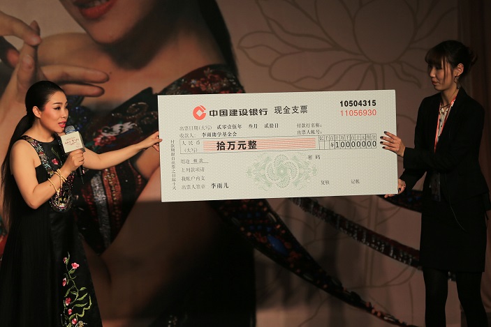 中宣部老干局党委书记薛启亮、著名画家杨珺、著名书法家孙俊斌、青年歌唱家莫小凤、“龙达觉萨唐卡艺术”董策力、河南中贵实业有限公司总经理薛洪涛、永州青年企业家代表分别向李雨助学基金会捐赠现金及实物。这一次现场捐赠现金达100万元整,其中包括李雨儿自己捐赠的十万元。