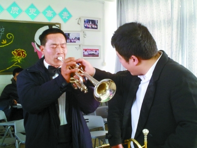 国交演奏员为北斗村农民管乐队成员手把手地教授小号