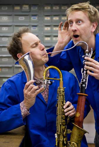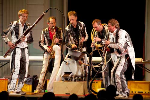 双簧管、单簧管、低音单簧管、萨克斯、巴松,五种古典管乐在五位演奏家的手中如同五只魔笛,不仅在古典乐和现代音乐之间游走穿梭,还加入了自由率性的即兴表演,一改古典乐庄严肃穆的“刻板”形象,显得格外平易近人。在演出中,演奏者们放弃了传统的黑色的礼服,充满颠覆感的化身为管子工人,在舞台上组装出了全新的乐器。伴随着演奏者引人入胜的形体表演,带有情节感的古典乐表现牢牢地抓住了孩子们的目光,连陪同观看的家长也被唤起了久违的童心,和孩子一起分享这难得的音乐时光。