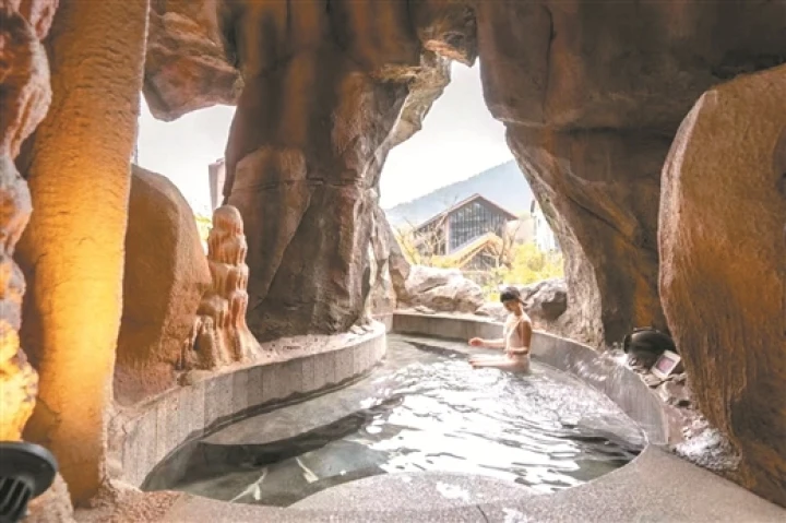 冬日时节,度假村温泉水温保持在50℃至70℃,浸泡在溶洞泉水中,外面环绕着青山和鸟语,里面则营造出幽静的泡汤空间,为游客带来独特的泡汤体验。