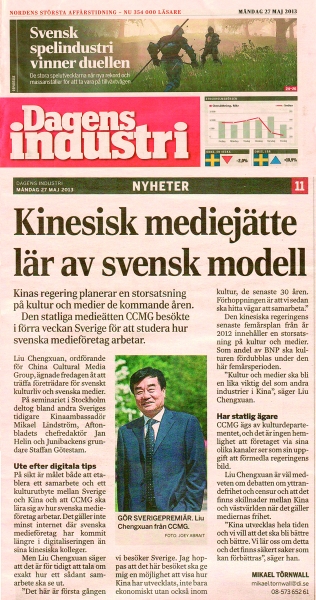 中国政府计划在接下来的几年里在文化和传媒领域进行大规模的投资。隶属于中国政府的传媒巨人——中国文化传媒集团(CCMG)代表团上周访问了瑞典,以了解瑞典传媒企业的运作模式。