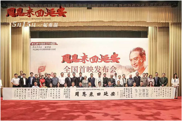 5月10日,为献礼新中国成立70周年而创作的重大革命历史题材电影《周恩来回延安》首映礼在人民大会堂举行。中宣部、中央党校、文化和旅游部、国家林业和草原局、全国总工会、中国作家协会等单位领导,中国文化传媒集团有限公司、天津市委宣传部、陕西省委宣传部等电影出品、摄制、赞助方领导,周恩来总理亲属、总理曾经身边的工作人员,电影主创、顾问团队,40余位延安知青以及文艺界、评论届专家学者等社会各界人士共700余人参加了首映礼。