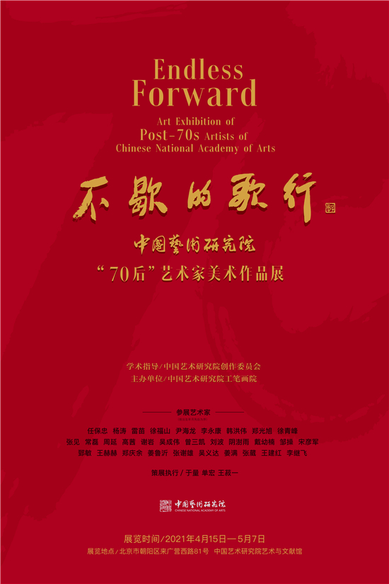 4月15日,由中国艺术研究院创作委员会指导、中国艺术研究院工笔画院主办的“不歇的歌行——中国艺术研究院‘70后’艺术家美术作品展”,在中国艺术研究院(北区)艺术与文献馆开幕。展览共展出中国艺术研究院31位“70后”艺术家的国画、油画、书法、篆刻、雕塑作品150余件。本次展览也是中国艺术研究院乔迁至新院址(北区)后,在艺术与文献馆举办的开馆首展。