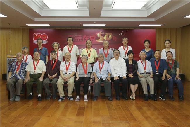 颁发仪式在雄壮的国歌声中开始,韩子勇向获得“光荣在党50年”纪念章的老党员代表颁发纪念章,代表院党委和领导班子,向获得纪念章的老党员表示热烈的祝贺并致以崇高敬意。
