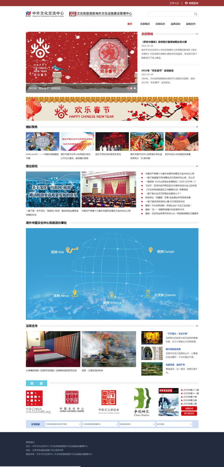 为促进文化和旅游事业充分融合,加强驻外文化和旅游机构总部(筹)与各海外中国文化中心和旅游办事处之间互联互通,3月10日,中外文化交流中心、文化和旅游部海外文化设施建设管理中心官网(一期)(http://www.cice.org.cn)正式开通上线。