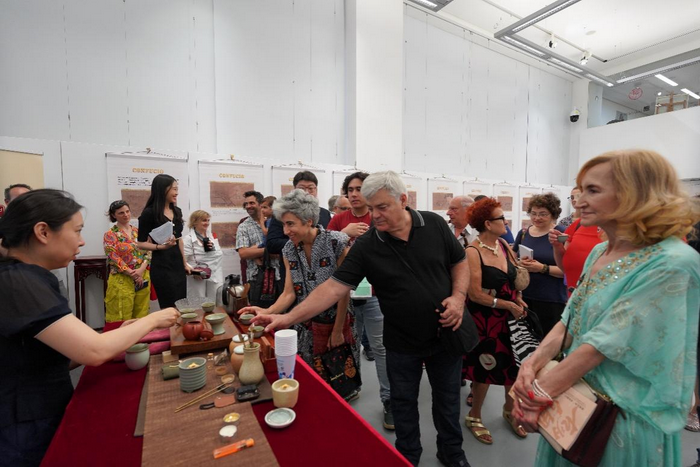 开幕式上还进行了拓印、茶道、香道等多项传统文化互动活动,并在展厅内滚动播放《论语》经典语录西语版短片,吸引众多观众驻足体验观看。