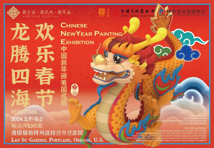 当地时间2月16日,由中外文化交流中心参与主办的“龙腾四海·欢乐春节——中国新年画美国巡展”活动在美国波特兰市兰苏园开幕。