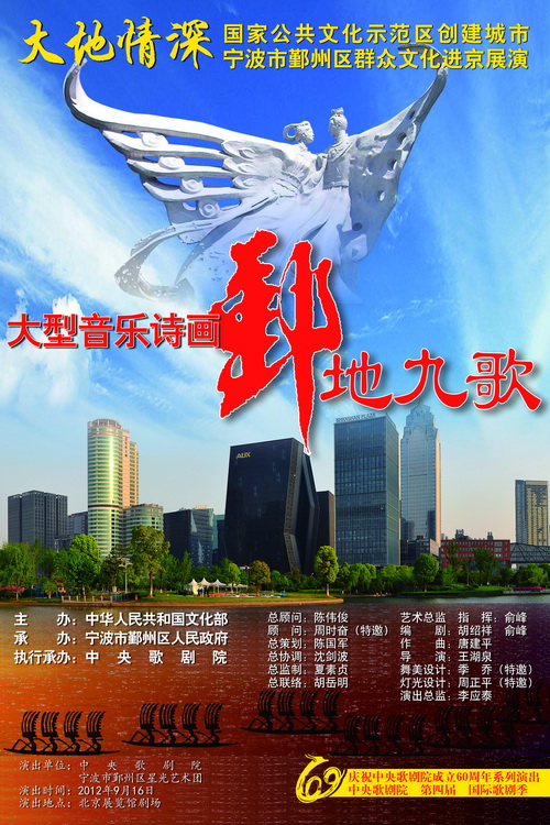 大型音乐诗画《鄞地九歌》是宁波市鄞州区人民政府和中央歌剧院携手打造的、形式新颖的大型音乐诗画舞台剧,是文化部主办的“大地情深”国家公共文化示范区创建城市宁波市鄞州区群众文化进京展演的剧目。2012年9月16日晚,中央歌剧院歌剧团、合唱团、交响乐团和舞台美术制作中心的350名艺术家将与来自宁波市鄞州区的星光艺术团、民间艺人和群众演员一起,在著名指挥家俞峰的指挥下将这部取自民间的舞台艺术精品在北京展览馆剧场呈现给广大观众。