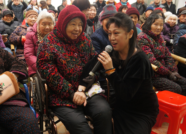 艺术家们一走进社会福利院的大厅,就受到了老人们热烈的欢迎。老人们拉着他们的手说,“你们来,我们高兴啊!路上辛苦吧?吃住都习惯不?”