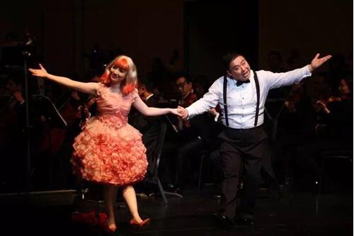 当晚的演出以管弦乐序曲拉开了帷幕。打扮成丑角的托尼奥探头招呼观众,道出开场白,揭开了这一场“戏中戏”。《丑角》讲述了巡回小丑剧团中女演员纳达与班主卡尼奥、村中青年西尔维奥的三角恋情所引发的悲剧故事。中央歌剧院男高音歌唱家李爽饰演的巡回剧团团长、戏中戏的丑角卡尼奥,中央歌剧院女高音歌唱家郭橙橙饰演卡尼奥之妻纳达,将戏里戏外的角色个性、情感纠葛展现得淋漓尽致。