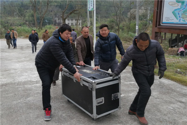从中复村到四都镇,过了一山又一山,山环着山,山围着山,当装着舞美装备的车接近目的地时,才发现桥的那头,山的另一头,才是演出场地——红军首次入闽纪念广场。车辆无法通行,沉重而繁多的装着各种音响设备的大箱子只能靠着舞美设计制作中心的艺术家们一个又一个地,艰难而又小心翼翼地推行前进。