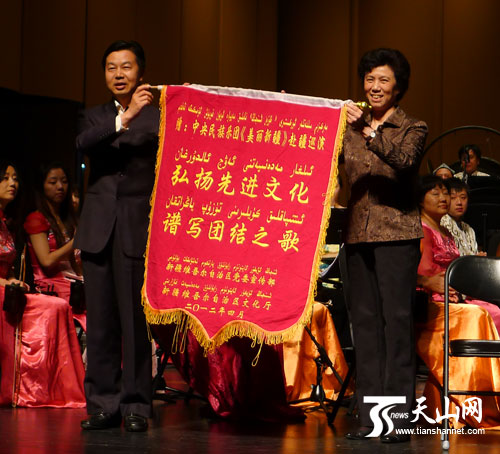 新疆维吾尔自治区党委副秘书长景海燕(左二)为中央民族乐团赠送锦旗