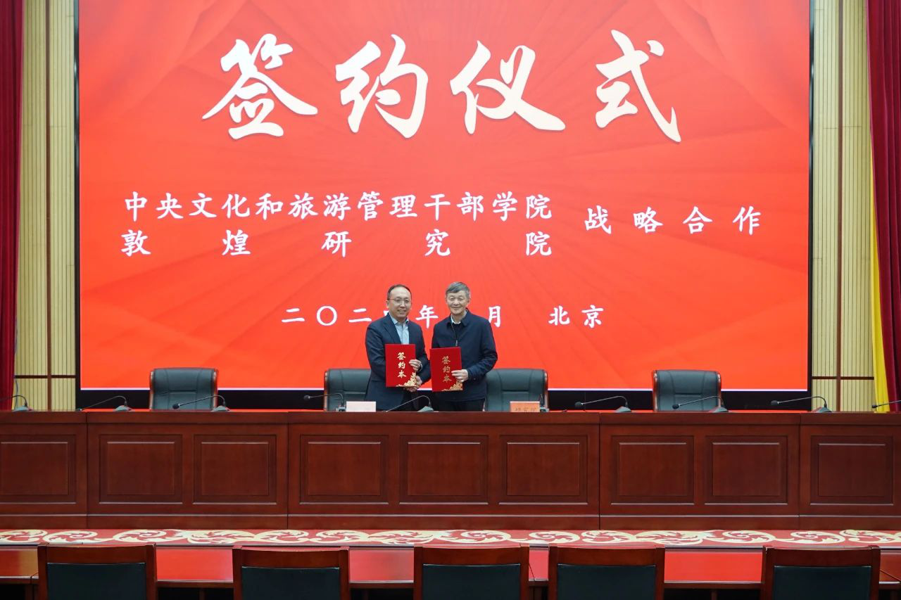 1月17日,敦煌研究院苏伯民院长一行5人应邀来院交流访问。期间,中央文化和旅游管理干部学院(以下简称“学院”)院长马峰、敦煌研究院院长苏伯民共同签署了《中央文化和旅游管理干部学院和敦煌研究院战略合作框架协议》。