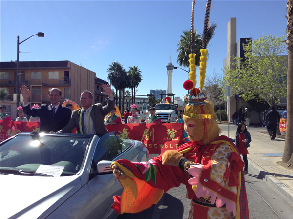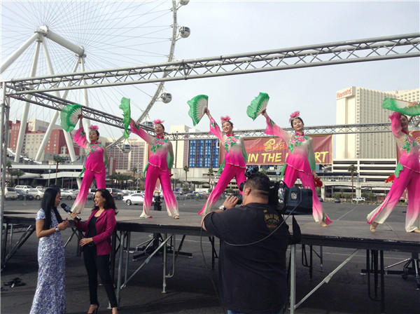 20日晚,拉斯维加斯“沙漠春节”庆典活动在拉斯维加斯最繁华的LINQ步行街和世界最大的摩天轮下隆重开幕。安徽艺术团演员们全程参加了开幕式演出、街会演出和新年大巡游,并去老人院慰问演出,所到之处深受欢迎。当地COX电视台对大巡游进行了现场直播,中央电视台驻洛杉矶记者进行了现场采访。