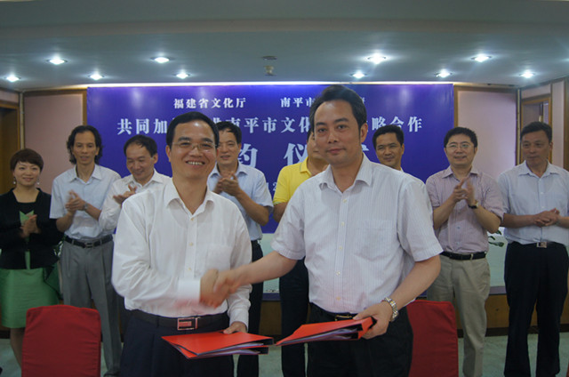 5月27日,福建省文化厅与南平市人民政府在武夷山市签署共同加快推进南平市文化发展战略合作协议。省政协副主席李祖可专程出席签约仪式。省文化厅党组书记、厅长陈秋平,南平市人民政府市长林宝金分别代表省文化厅和南平市人民政府在协议上签字,南平市委常委、宣传部长兰斯文,副市长刘亚圣,武夷山市市长徐春晖,省厅、南平市、武夷山市相关部门负责人,省文化企业协会部分企业家,以及中央、省、市新闻媒体见证了签约仪式。