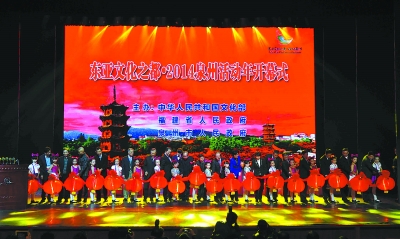 文化部副部长丁伟、福建省委宣传部部长李书磊、福建省副省长李红、泉州市市委书记黄少萍、韩国东亚文化之都促进委员会委员长郑东采、日本横滨市副市长渡边巧教等中韩日嘉宾点燃彩灯,为“东亚文化之都·2014泉州活动年”启幕