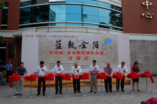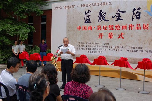 6月9日,由新疆维吾尔自治区人民政府主办,文化部社会文化司、新疆维吾尔自治区文化厅、广东省文化厅承办,新疆维吾尔自治区文化馆、广东省文化馆、广州市越秀区文化广电新闻出版局、广州市越秀区文化馆协办的2012年“春雨工程”全国文化志愿者边疆行之蓝靛金箔·桑皮纸绘画作品展览在广州市越秀区文化艺术中心展出。