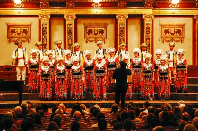 身着苗家盛装的湖南省歌舞剧院艺术团演员在金色大厅里纵情歌唱。