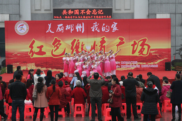 3月15日上午,湖南郴州市“欢乐潇湘·美丽郴州我的家·红色激情广场”群众文化活动在湘南起义纪念馆广场拉开帷幕。来自红歌艺术团、女干部艺术团等11支业余文艺团队的300多名文化志愿者冒着霏霏细雨,为现场的群众演出了一个又一个的精彩节目,受到了群众的热烈欢迎。