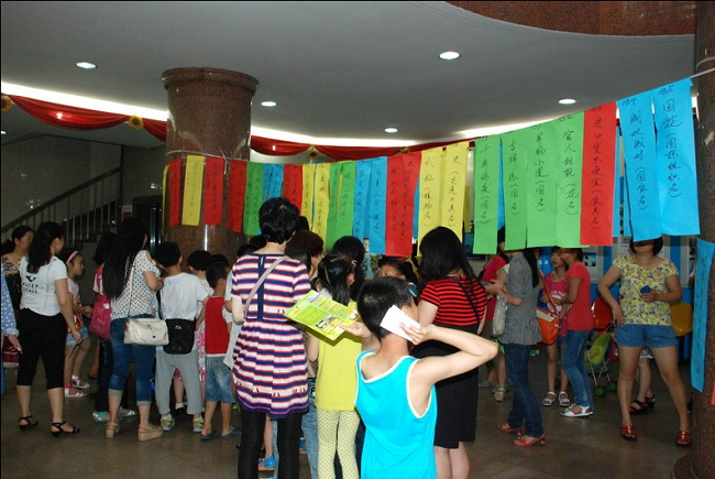 馆前巨大的熊猫彩色气垫船上,孩子们顾不上炎热的天气,边蹦、边笑、边叫喊,玩得满头汗水。一楼大厅举办的猜谜大赛,吸引了不少孩子和家长参与。一条条五颜六色的谜语吸引了抱着宝宝的家长、头发花白的老者等,大家驻足思考、冥思苦想,猜中者自然一脸胜利的喜悦。