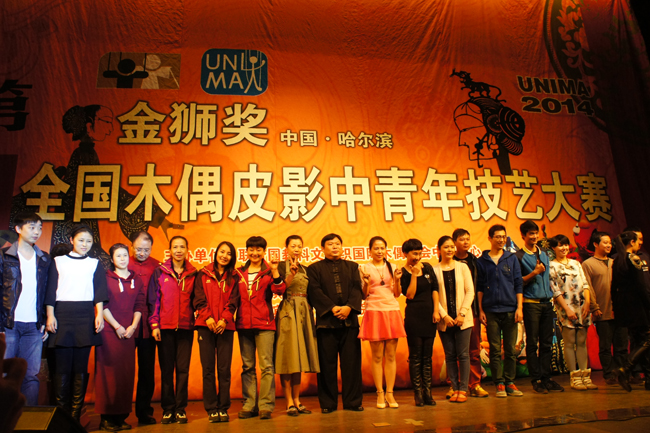 湖南省木偶皮影艺术保护传承中心演员冯微(左五)、谭欧(左六)、陈艳(左七)获“最佳表演奖”