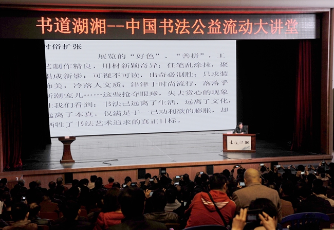 “书道湖湘”大讲堂是省书协自今年起着力打造的公益性书法学术讲坛,本期首讲与中国书法公益流动大讲堂合并举办。(来源:湖南省文化厅)