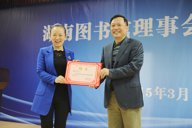 湖南省文化厅党组书记、厅长李晖(左)为理事会理事颁发聘书。图为为理事禹新荣颁发聘书