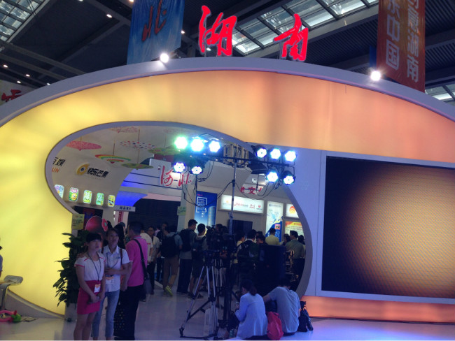 今天的深圳会展中心里人流如织,来自全国各地的文化产业精英产品济济一堂,竞相展示自己“高大上”的一面。其中,设计简洁时尚的湖南展馆尤其引人注目。从远处看,湖南展馆的外墙上10个湖南文化旅游小镇的宣传海报一字排开,秀丽风景让人眼前一亮;走进展馆内部,湖南日报新闻客户端、《爸爸去哪儿》手机游戏和湖南有线集团展示的3D虚拟博物馆等互动性极强的展品吸引了大批观众排队体验,通过科技手段展示湖南美丽母亲河的碧水湘江创意秀看得人流连忘返,纷纷拿出手机自拍、互拍留念……湖南展馆里,琳琅满目的展品无不在诠释湖南展团“互联、融合、创新”的主题,展示“文化+科技”、“文化+金融”、“文化+旅游”等文化融合发展的湖南创意。